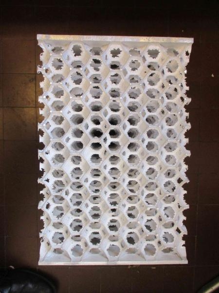 Dans un premier temps, des calculs menés sur plusieurs configurations différentes (masses de nacelle, vitesses de décélération, contraintes…) ont permis d’estimer la porosité et l’élasticité de la mousse à utiliser et ainsi de définir le diamètre optimal de la cellule. Une fois la géométrie de la mousse validée, certai-nes données ont été fixées (poids de la nacelle, porosité de la mousse), occasionnant de nouveaux calculs pour la fabrication d’un bloc de mousse de 300x300x400 mm.
